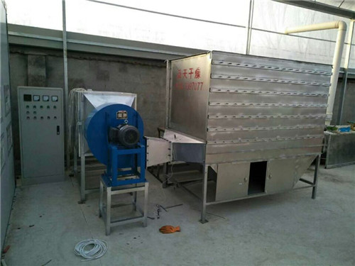 熱源可用電、燃?xì)狻:娓蓹C(jī)為七層,烘干箱外側(cè)的每一層都有一個手動搖柄,先把最頂層放上鮮料,攤平;這層物料水分最大,熱風(fēng)與鮮、濕物品接觸,產(chǎn)生大量水蒸汽直接排空,待一定的時間看上去水蒸汽不多后,搖動第一層烘箱手柄,搖到第二層,再把第一層補(bǔ)上鮮料,再隔一段時間繼續(xù)把第一層和第二層搖動手柄把鮮料放到下一層,就這樣依次倫推,循環(huán)翻轉(zhuǎn),逐層烘干。